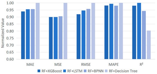 Subsequently, to demonstrate the appropriate combination of RF and XGBoost, the RF is settled as the base to generate residuals, which are then employed as the inputs to other prediction models (LSTM, BPNN, and decision tree) for the same prediction task. After training and testing under the same conditions (i.e., 60% for training and 40% for testing), the results are depicted in