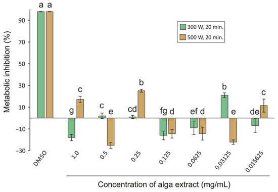 The cytotoxicity assay was performed using the HaCat cell line on the extracts from MHG conditions 300 W, 20 min and conditions 500 W, 20 min. The results obtained are depicted in Figure 2, and show that, at the concentrations tested (from 0.015625 to 1 mg/mL), neither of the samples showed any cytotoxicity in relation to the cells used. Tukey’s test was used to compare the results obtained for different concentrations in each extraction condition (in Figure 2, different letters mean significant differences among different concentrations of the extract). Student’s t-test revealed that the results between extracts for each concentration were significantly different, including for 0.5 mg/mL.