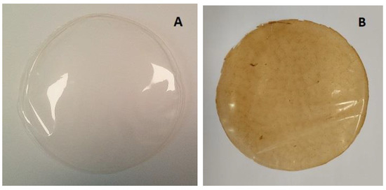The antioxidant activity of the films was determined by the 2,2′-azinobis (3-ethylbenzothiazoline-6-sulfonic acid) (ABTS), and the 2,2-diphenyl-1-picrylhydrazyl (DPPH) scavenging assays, according to Lopes et al. [36]. Briefly, the ABTS solution concentration was adjusted with water to an initial absorbance of 0.700 ± 0.020 at 734 nm (Synergy H1, Biotek, Winooski, VT, USA). The DPPH working solution (90 µM) was prepared with methanol in order that the absorbance reached 0.600 ± 0.100 at 515 nm. Each film was cut into 1 mg pieces, which were placed into test tubes and the ABTS or DPPH solution (2–8 mL) was pipetted into each tube, protected from light exposition and at room temperature (25 °C). The tubes with ABTS and DPPH were left to react for 6 min and 30 min, respectively, and then the absorbance was measured at 734 nm (ABTS) and 515 nm (DPPH). The results were expressed as µM Trolox equivalents per mg of film (TE µM/mg film). All analyses were performed in quadruplicate.