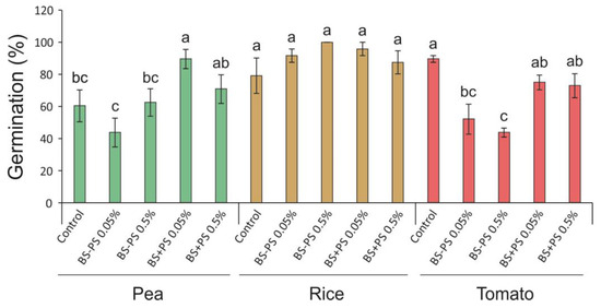 Germination rate (%) of pea, rice, and tomato seeds at 14 days after sowing treated with Fucus spiralis residue (BS = biostimulant) with (+) or without (−) polysaccharides (PSs) in two different concentrations (0.05% and 0.5%). Bars represent mean ± SE (n = 6 for pea and tomato; and n = 3 for rice). Different letters indicate statistically significant differences (p < 0.05) between tested conditions (Control, BS-PS 0.05%, BS-PS 0.5%, BS+PS 0.05%, and BS+PS 0.5%) in each plant species.