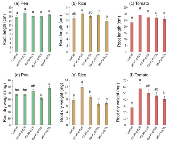 Root length and dry weight of pea (a,d), rice (b,e), and tomato (c,f) seedlings treated with Fucus spiralis residue (BS = biostimulant) with (+) or without (−) polysaccharides (PSs) in two different concentrations (0.05% and 0.5%) for 14 days (pea), 22 days (rice), and 28 days (tomato). Bars represent mean ± SE (n = at least 18). Different letters indicate statistically significant differences (p < 0.05) between tested conditions (Control, BS-PS 0.05%, BS-PS 0.5%, BS+PS 0.05%, and BS+PS 0.5%) in each plant species.