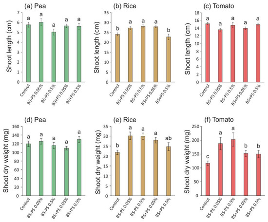 Shoot length and dry weight of pea (a,d), rice (b,e), and tomato (c,f) seedlings treated with Fucus spiralis residue (BS = biostimulant) with (+) or without (−) polysaccharides (PSs) in two different concentrations (0.05% and 0.5%) for 14 days (pea), 22 days (rice), and 28 days (tomato). Bars represent mean ± SE (n = at least 18). Different letters indicate statistically significant differences (p < 0.05) between tested conditions (Control, BS-PS 0.05%, BS-PS 0.5%, BS+PS 0.05%, and BS+PS 0.5%) in each plant species.