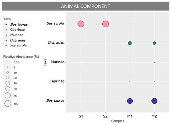 Animal composition in sausage (S1, S2 replicates) and minced meat (M1, M2 replicates) samples. The size of each circle represents the percentage of reads in each replicate over the total reads found in that replicate.