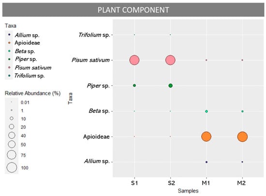 The relative abundance of reads attributed to the different taxa is shown in Figure 2 and in Table 1. Molecular analysis revealed that the main constituent of the sausage samples (S1 and S2) was Pisum sativum (93% and 87.2%), followed by Piper spp. (6.6% and 12.5%) and traces of Trifolium spp. (0.3% and 0.3%), Apioideae (0.04% and 0.04%) and Beta spp. (0.01% and 0.01%). The minced beef sample (M1 and M2) was dominated by Apioideae (92% and 95.5%), alongside a small quantity of Beta spp. (5% and 2.3%) and Allium spp. (2% and 1.3%) and traces of Pisum sativum (0.9% and 0.9%).