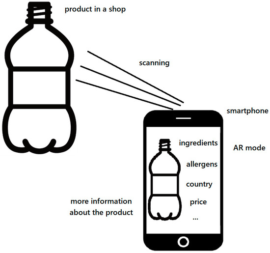 Scan&Go technology represents a further innovation in self-service shopping. Customers utilize handheld scanners (store-provided devices) or their own smartphones to scan products as they shop, placing items directly into their bags. This technology can have different names depending on the shop. When it comes to a special scanner (Figure 2), this device can be taken by a client free of charge in the store of a given supermarket. Then, the products can be scanned and this way the customer creates their own shopping list. Moreover, products can also be removed from the device if the customer decides not to purchase a given product. Customers can also use their own smartphones, but to do so they must download a special application related to a given store or supermarket in the first place. This method provides a seamless and personalized shopping experience, enabling shoppers to track spending in real-time and access digital coupons or promotions. Figure 3 shows the scheme of Scan&Go technology using a smartphone.