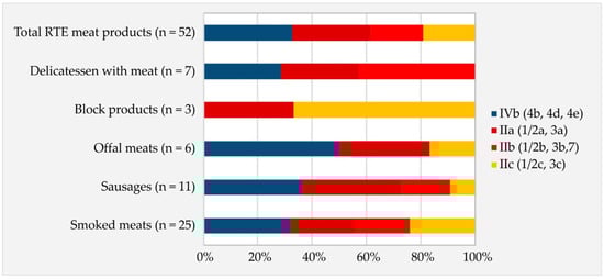 In the present study, four serogroups were identified among the L. monocytogenes isolates, i.e., IVb, IIa, IIb and IIc (Figure 1). Isolates belonging to the serogroups most frequently responsible for listeriosis in humans in Poland accounted for 62% of all isolates (IVb 17/52; 32.6% and IIb 15/52; 28.9%), which indicates that RTE meat products from this region of Poland may be a potential source of foodborne listeriosis. The distribution of individual serogroups in the analyzed RTE product category differed from those reported by other authors in the same product category. Maćkiw et al. [13] (n = 70) found that the most frequent serogroup was IIa (51%), then serogroups IIc (21%), IIb (14%) and IVb (13%), while Henriques et al. [23] (n = 81) showed that the most frequent serogroup was IIb (33%), followed by IVb (27%), IIa (27%), IVa (7%) and IIc (7%). Qualitative and quantitative differences in distribution patterns of the serogroups were also observed between RTE product categories [28]. Serogroup IVb and/or IIa were most frequently reported in RTE meat products, serogroup IIc or IIa in fish products, serogroup IVb or IIa in dairy products and serogroup IIc or IIa in vegetable products [28]. An analysis of the prevalence of individual serogroups linked to producers and ingredients of RTE foods showed that their distribution was related to the prevalence of “intra-plant isolates” of L. monocytogenes, which persistently colonized the food processing environments [28].