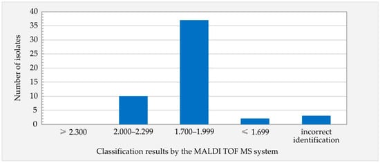 The isolates were cultured on a tryptone soya yeast extract agar medium (TSYEA) (Biomaxima, Lublin, Poland) at 37 ± 1 °C for 24 ± 1 h and processed according to the manufacturer’s instructions using the extraction method. For the analysis, 1 μL of supernatant was spotted on the MSP 96 steel target plate (Bruker, Bremen, Germany), air-dried and overlaid with 1 μL of matrix solution (α-cyano-4-hydroxycinnamic acid) (Bruker Daltonics, Bremen, Germany). The dry plate was then placed in the analysis chamber. Mass spectra were generated and analyzed (m/z range of 2000–20,000 Da) using an UltrafleXtreme mass spectrometer and MALDI Biotyper (v. 3.1 software package) with a reference database (8468 reference profiles) and the manufacturer’s settings (Bruker Daltonics, Bremen, Germany). For each isolate, 3000 laser shots were collected. Analysis of each sample was performed in triplicate. The Bruker bacterial test standard (Bruker Daltonics, Bremen, Germany) was used for calibration according to the manufacturer’s instructions. Identification results were interpreted according to the manufacturer’s criteria, i.e., 0–1.699—not reliable identification; 1.700–1.999—probable genus identification; 2.000–2.299—secure genus identification, probable species identification; and 2.300–3.000—highly probable species identification. The classification of the analyzed isolates was verified by generating an MSP dendrogram using the MALDI Biotyper (v. 3.1 software package) (Bruker Daltonics, Bremen, Germany).