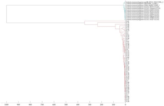 MALDI-TOF MS dendrogram for the 52 analyzed isolates (marked in red) and the reference strains of L. monocytogenes (marked in blue). Distance level represents the relative distance used in the clustering analysis.