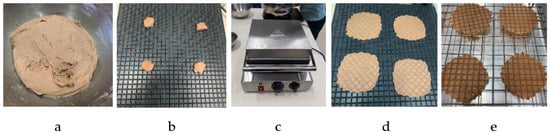 Okara flour was used as a substitute for glutinous rice flour in varying proportions: 10%, 20%, 30%, and 40% by weight. The waffle batter was prepared using the recipe detailed in Table 1. The process began with thoroughly mixing the dry ingredients, followed by gradually adding coconut milk until a homogenous batter was achieved (Figure 1a). After allowing the batter to rest for 5 min, 4 g portions were placed onto a preheated waffle maker set at approximately 125 °C (Figure 1b). The batter was then cooked in the waffle maker (Figure 1c). Each side of the waffle was baked for one minute to ensure even cooking and a crisp texture (Figure 1d). Post-baking, the waffles were carefully removed and allowed to cool to room temperature (Figure 1e). For storage, the waffles were placed in laminated aluminum foil pouches to maintain their quality and crispness until further analysis. The 12 × 20 cm2 laminated foil pouches were made from a laminated film consisting of polyethylene terephthalate, aluminum, and polyethylene with a zip lock.