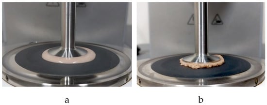 The dynamic oscillatory shear measurements of the viscoelastic properties of the samples followed those previously reported by Aussanasuwannakul et al. [10] using a modular compact rheometer (Model MCR 302; Anton Paar, Graz, Austria) with parallel-plate geometry, a 25 mm diameter for the upper plate, and a gap width of 1 mm. The linear viscoelastic (LVE) range was determined using amplitude sweep tests before starting frequency sweep tests. To understand the structural character of the samples, amplitude sweeps were carried out by implementing a logarithmic increase of the strain () from 0.01% to 100% with six measuring points per decade and a constant angular frequency (ω) of 10.0 rad/s. The temperature was set to remain constant at 25 °C. Storage moduli (G′) and loss moduli (G″) were recorded and analyzed using RheoCompassTM software (Version 1.30, Anton Paar GmbH, Graz, Austria). The LVE range within which the G′ and G″ ran parallel to the x-axis was identified. The structural strength of the sample batter was expressed as the G′ value within the LVE range. Further, the limiting value of the LVE range () was the strain value at which the G′-curve begins to deviate from the LVE plateau with the range of the tolerated deviation at 5%. The flow point (%) at crossover point where G′ = G″ was also identified. A frequency sweeps was performed at 25 °C with ω = 100.0–0.1 rad/s with three measuring points per decade in a pre-determined linear viscoelastic range at = 0.01% or 0.05% predicted for each sample to investigate the time-dependent deformation behaviors of the samples. Loss factor or damping factor , which is calculated as the G″/G′, reveals the ratio of the viscous and the elastic portion of the viscoelastic deformation behavior. Complex viscosity () signified the viscoelastic flow resistance of the sample. The values of , and were recorded at 10 rad/s. Figure 3 shows the filling of the plate/plate measuring system of the MCR302 during gap setting with waffle batter.