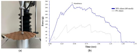 Data were recorded and analyzed using Texture Exponent software (version 3.0.5.0; Stable Micro Systems Ltd., Godalming, Surrey, UK). The maximum force required to deform the sample was recorded as the hardness. The results from the 12 replicates were averaged, and the standard deviation was calculated to provide a measure of variability in the hardness of the okara waffles.