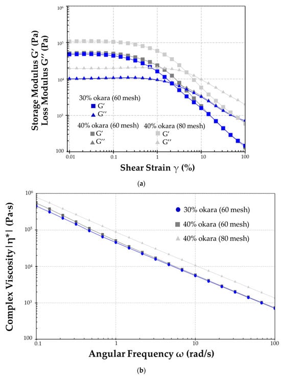 (a) Storage modulus (G′) and loss modulus (G″) of waffle batters with varying okara flour content and particle sizes during amplitude-sweep tests. (b) Complex viscosity as a function of frequency during frequency-sweep tests. (c) Shear strain over time for waffle batters with varying okara flour content and particle sizes during creep–recovery tests.