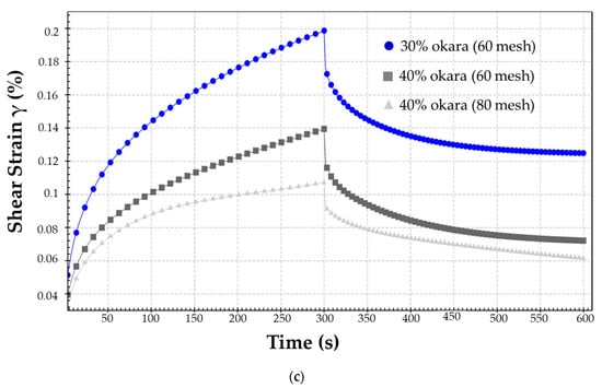Figure 5a,b illustrate the storage modulus (G′) and loss modulus (G″) as well as the shear strain over time during the amplitude sweep and creep and recovery tests, respectively. These figures further highlight the differences in rheological properties between the batters with varying okara flour content and particle sizes.