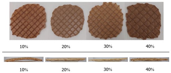 As illustrated in Figure 6, the top view and side view of crispy waffles with varying okara flour content (10%, 20%, 30%, and 40%) show noticeable changes in physical appearance and texture. The visual differences highlight how okara flour affects the spread ratio and texture of the waffles.