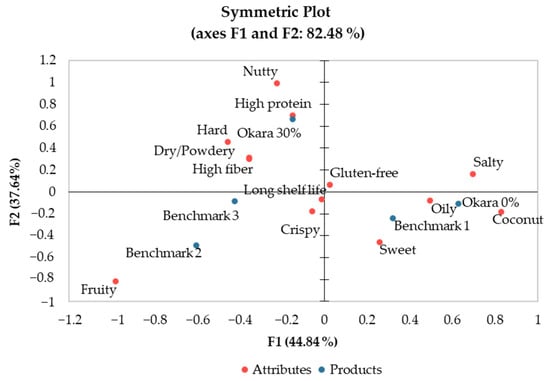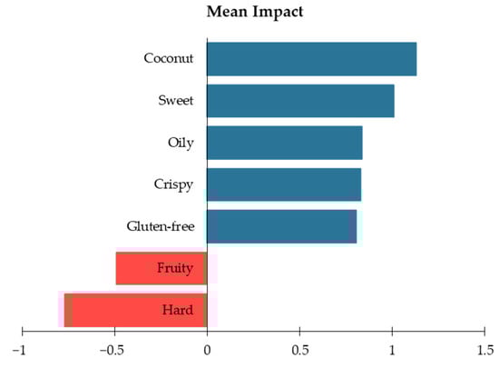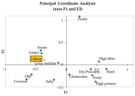 Understanding consumer preferences and optimizing sensory attributes are crucial for product development. The principal coordinate analysis (PCoA) in our study captured 40.56% of the variance, with the first axis (F1) explaining 23.49% and the second axis (F2) explaining 17.07%. Oliveira et al. (2023) [16] used PCA to analyze the sensory attributes of almond skin-supplemented waffles, explaining 82.48% of the variance in their dataset. They highlighted attributes like “colour”, “roasted aroma”, and “dissolubility” as important for consumer preference. In our study, attributes such as “sweet”, “crispy”, and “long shelf life” significantly drive consumer liking. Comparing the two studies, while both identified texture and flavor attributes as critical, our study emphasized sweetness and crispiness more, likely due to the different sensory profiles imparted by okara versus almond skin.