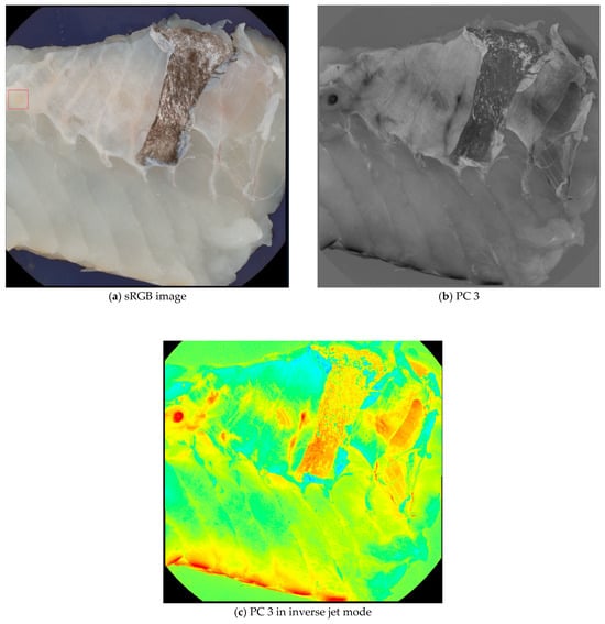 Comparison of a sRGB image (a) and a PC 3 (b,c) images from the data set. Although the nematode in the upper left corner (seen within the red box) is visible in the sRGB image, it is easier to spot in the PC 3 images.