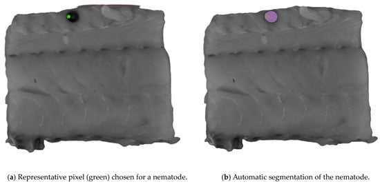 The Computer Vision Annotation Tool (CVAT, www.cvat.ai, CVAT.ai corporation, Pathos, Cyprus) was used to create the annotations for the dataset. The Segment Anything Model (SAM) [] was used for assistance in the labeling process. When using SAM, an object can be segmented with only a few clicks on representative pixels for the object of interest. SAM was trained to have a general understanding of what objects are likely to be present. Originally, the SAM was trained by Meta AI (www.meta.ai (accessed on 30 May 2024)) to have a general understanding of what objects are likely to be present in an image. An example of the process is presented in Figure 2. This capability allows the SAM to recognize unfamiliar objects without needing any further training, and because of its zero-shot generalization ability, the SAM was selected for labeling. Nematodes were the only class objects labeled, and 173 were labeled. Labels were exported as ground truth masks.