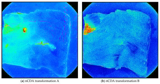 In this study, nCDA was used to separate different fish fillet components that may seem similar to our eyes, such as distinguishing fish muscle from clear or yellow nematodes, as well as veins and blood from nematodes that are reddish in color. Two different kinds of nCDA transformations were made, using 54 images as training data, and 216 images for test data. Each image was 2992 × 2992 pixels, but only a subset of representative pixels for each class (e.g., nematodes, fish muscle, blood, bruises, and skin) was manually selected for training. Since the number of nematodes and the pixels representing them was limited, this separation was chosen to ensure more representative results. The remaining pixels in the training images, which were not used for training, were used for validation to confirm the model’s performance before applying it to the test set.