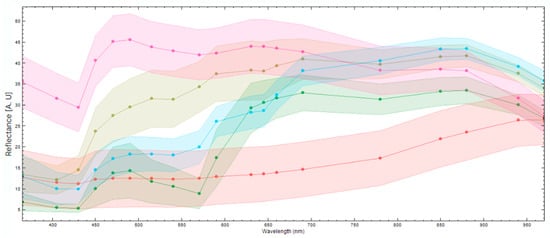 To differentiate between different components in the fish fillet, it is necessary to see if the spectral responses of these components differ enough to distinguish them. Figure 5 displays the mean spectral reflectance response and standard deviation of various components in the fish fillet. It is evident that the fish muscle (pink) and darker nematodes (blue) can be clearly distinguished in the UV region, the visual spectral range, and part of the NIR region (880–970 nm). The nematodes, lighter in color (olive green), are distinguishable from the fish muscle in the UV region and part of the visual spectra (400–570 nm). It is harder to distinguish between the light nematodes and the fish muscle in the higher end of the visual spectra (590–750 nm) and part of the NIR region, except for 880–970 nm. Blood (green) is distinguishable from darker nematodes in the UV region and the NIR region, but it is harder to distinguish between them in the visual spectral range, except at wavelengths 500–550 nm. Skin remnants (red) are distinguishable from the nematodes in most of the visual spectra and the NIR region however, it is more difficult to distinguish between the darker nematodes and the skin in the UV region, as well as in the lower visual region (400–450 nm). Note the spectra of the nematodes are from nematodes that were on or close to the surface of the fish muscle. These results underscore the added value of extending beyond the visual spectra range for the identification of nematodes or other defects.