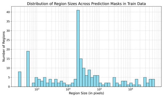 The model’s prediction masks include numerous noisy pixels. Figure 7 displays the region sizes in the training data’s masks.