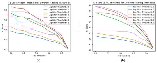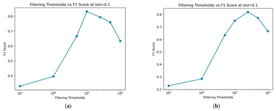 In this study, the goal is to detect nematodes, allowing the setting of an appropriate IoU threshold without excess. By fixing the IoU threshold at 0.1, the effect of different size filtering thresholds on the F1 score can be observed. As demonstrated in Figure 9, an overly large filtering threshold detrimentally affects the model’s performance. It should be highlighted that when several predicted regions overlap with the same ground truth area, only the Intersection over Union (IoU) of one of these regions is assessed. After a ground truth region has been marked as a true positive, any additional overlapping predictions are not evaluated for IoU. In such scenarios, with a fixed IoU threshold, at least one of the overlapping predicted regions meets or exceeds this threshold. However, a limitation of this approach is that it does not provide a comprehensive evaluation of the actual IoU between the predictions and the ground truth. Nonetheless, since the primary goal of this study is to maximize nematode detection, the IoU threshold is set appropriately to avoid excessive stringency. Figure 9 also verifies what we see in Figure 8, that log scales 5 and 5.7 filter thresholds achieve the highest F1 score, for training and test sets, respectively.