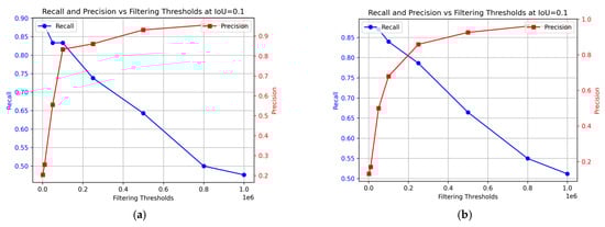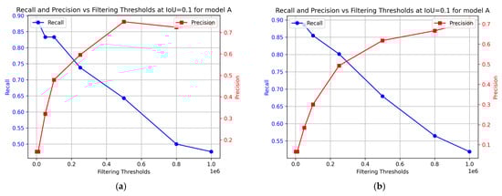 Figure 10 illustrates how the model’s recall and precision vary with different filtering thresholds. This study considers optimal performance as achieving both high recall and precision simultaneously. The preferred balance may vary based on specific circumstances and the emphasis on higher recall or precision. In this context, prioritizing recall might reduce precision and potentially compromise the quality of the fish, while prioritizing precision might lead to lower recall, impacting food safety. The optimal balance for ensuring the best consumer experience of the final product remains undetermined. In the training data, the optimal performance was achieved at a 0.1 × 106 threshold (Figure 10a), with recall at 83% and precision at 83%. For the test data, the best results were obtained at 0.23 × 106 filtering threshold, achieving 88% precision and 79% recall.