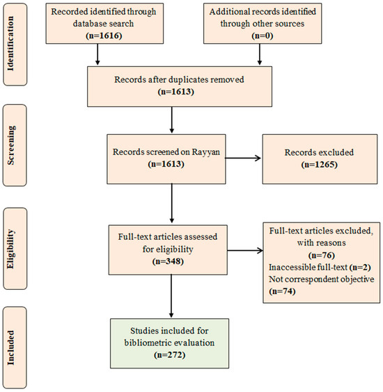 With the applied research strategy, a total of 1616 documents were retrieved, including 1577 (97.6%) original articles and 39 (2.4%) review articles. Three documents were detected as duplicates and were excluded, and 1613 were subjected to evaluation of titles and abstracts in Rayyan. A total of 1265 documents were excluded because they did not present the research descriptors in the titles and abstracts, and 348 advanced (Table S1 Supplementary Materials). The documents included at this stage underwent a full-text availability assessment, resulting in the exclusion of two that only presented a title and abstract, with the full-text not available on the Web of Science database. A total of 346 documents were thoroughly textually reviewed, and 74 were excluded due to their corpus not aligning with the objective of this review. Consequently, 272 documents were selected for the bibliometric analysis (Table S2 Supplementary Materials).