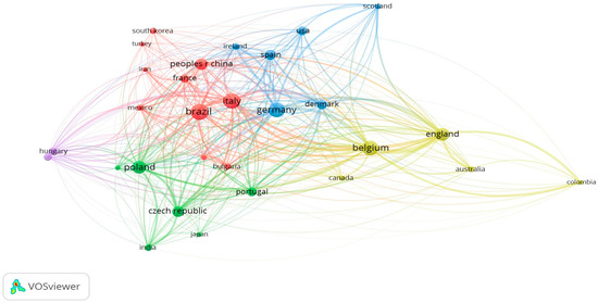 Network visualization map depicting the scientific production of 29 countries that meet the criteria outlined based on the 272 documents included in this study.