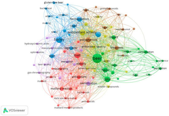 Cluster two, with 18 items, is represented by green, and the keyword with the highest occurrence is beer. Cluster three has 16 items, is delimited by blue, and barley is the keyword with the highest occurrence. Clusters four (15 items), five (12 items), and six (11 items) are represented by yellow, purple, and brown, and the most frequently occurring keywords are antioxidant activity, identification, and polyphenol, respectively. The greater occurrence of the terms barley, malt, polyphenols, and antioxidant activity within the clusters suggests that these terms constitute the main keywords guiding researchers in studies aimed at understanding beer color.