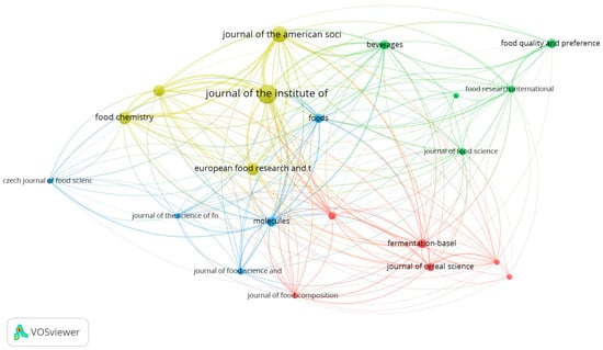 The two periodicals have a scope linked to the manufacture and fermentation of beer, as well as raw materials and by-products of distillation. This likely justifies why they occupy the first two positions in the ranking. The third position is occupied by the European Food Research and Technology journal (H-Index 116 and impact factor of 3.93 for the period 2022–2023), closing the podium with 14 publications and 123 citations. The documents published by the three journals correspond to around 40% of the articles published by the 21 journals selected in VOSviewer and 43% of all citations, indicating the influence of these journals on the topic under study.