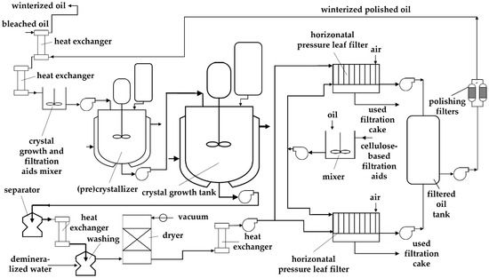 This study focused on the filtration of sunflower oil during industrial winterization. Winterization is a refining stage aimed at removing waxes from the oil. Prior to winterization, oil neutralization was performed through acid degumming, followed by oil deodorization. The industrial refining capacity was 200 tons of crude oil per day. The process flow diagram for the winterization stage is shown in Figure 1. During oil filtration, specialized cellulose-based filtration aids were used for both pre-coating and dosing. The filter cake was separated using two horizontal pressure leaf filters (Amafilter BV, Alkmaar, The Netherlands) after drying the filters with compressed air for 15 min. The oil temperature during filtration was 16 °C. The filter volume was 6880 L, with a total of 30 filter leaves. Each leaf had a surface area of 2 × 1 m2, resulting in a total filtration area of 60 m2. Two filters were employed and operated alternately.