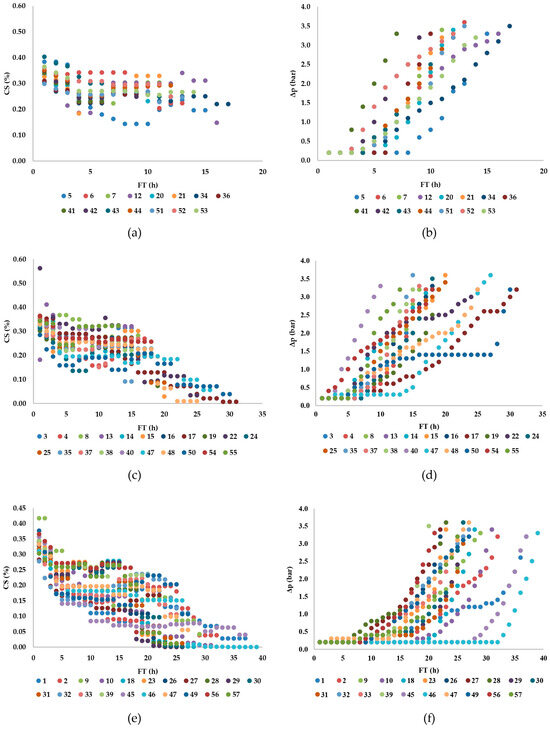 Figure 2. Suspension concentration of dosing filtration aid—CS (left)—and pressure differential—Δp (right)—during the filtration of sunflower oil with high (a,b), medium (c,d), and low (e,f) wax content.