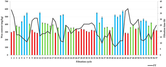It has been observed that oil filtrations with lower wax content last longer, as indicated by Figure 3 and the tested correlation (R2 = −0.77; p = 0.00). Filtration cycles lasted from 7 h, observed during filtration cycle 41, to 39 h during filtration cycle 46 (Table 2). Concentrations of the filtration aid for dosing are generally slightly higher for oil filtrations with higher wax content, as previously determined by Dahlstrom et al. (1997) [13] and Ergönül and Nergiz (2015) [22]. Based on recorded parameters of the filtration process during sunflower oil winterization, differences were observed between filtration cycles of oils with different wax content. Application of the Kruskal–Wallis test revealed a significant difference among the following three sample groups: oils with low wax content (≤350 mg/kg, a total of 21 oil samples, with an average wax content of 311.57 ± 18.89 mg/kg), oils with medium wax content (≤430 mg/kg, a total of 21 oil samples, with an average wax content of 383.00 ± 24.12 mg/kg), and oils with high wax content (15 oil samples, with an average wax content of 504.93 ± 42.83 mg/kg).