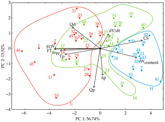 When analyzing the projection of variables onto the factor plane, notable positive contributions to the first principal component (PC1) were observed: Wcontent (10.30% based on correlation) and CS (13.68%). Conversely, FT (15.85%), Tp const. (9.47%), FO (15.89%), V (15.89%), and mW (12.08%) had the most negative impact on the PC1 component. On the other hand, Qd (14.87%) and dV/dt (7.00%) significantly contributed positively to the second principal component (PC2), while Qp (49.12%) and Δp (22.97%) contributed negatively to the PC2 component, as shown in Figure 4.
