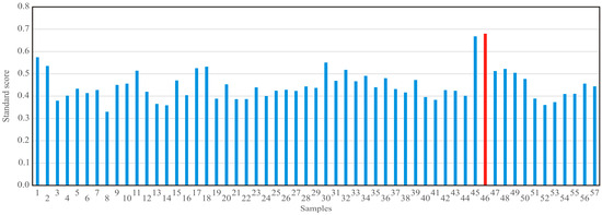 Figure 5. Standard scores for 57 samples. The red color in the column highlights the optimal sample, indicating that this sample has been identified as optimal sample.