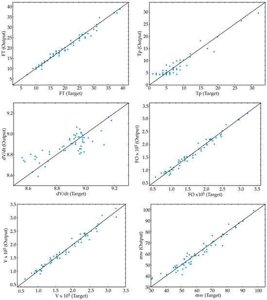 The models’ feature fit was assessed and presented in Table 4, showing that the ANN models exhibited a minor lack of fit tests, indicating a satisfactory prediction of the analyzed parameters. The r2 values for FT, Tp const., dV/dt, FO, V, and mW predictions were 0.967, 0.924, 0.703, 0.966, 0.959, and 0.953, respectively, suggesting that the models accurately evaluated variations and fit the data well. This is also indicated by the dependence of experimental and predicted values obtained for FT, Tp const., dV/dt, FO, V, and mW, as shown in Figure 6.