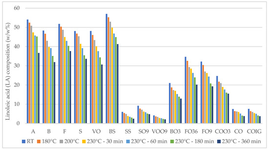 Changes in linoleic acid (LA) values in fifteen plant-based oils in fresh samples and at 180 °C, 200 °C, 230 °C—30 min, 60 min, 180 min, and 360 min.