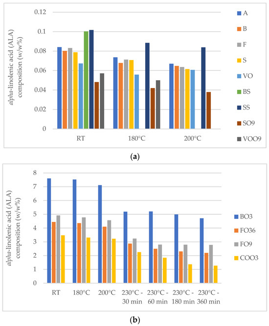 Changes in alpha-linolenic acid (ALA) values in (a) sunflower and high-oleic sunflower oils in fresh samples and at 180 °C and 200 °C; and (b) rapeseed oil and oil blends in fresh samples and at 180 °C, 200 °C, and 230 °C—30 min, 60 min, 180 min, and 360 min.