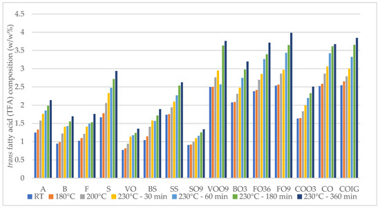 Upon subjecting the vegetable oils to predetermined temperatures and durations of heating, the TFA values in each oil markedly increased compared to their respective fresh samples (Figure 3), with the most pronounced elevation observed in sunflower oil (81.39%). High temperature treatment can induce the formation of trans fats in oils via oxidation processes. The extent of increase between the fresh and 230 °C—360 min samples ranged from 53.99% in rapeseed oil, 45.61–51.03% in extra virgin olive oil, 71.08–81.39% in sunflower oil, 47.74–50.52% in high-oleic sunflower oil, and 53.49–57.18% in oil blends. For refined sunflower oils, trans fat production was more influenced by temperature than prolonged heat exposure. On the other hand, vegetable oils, such as EVOO, high-oleic sunflower oil, and rapeseed oil were more affected by prolonged heat exposure at 230 °C. However, under the examined conditions (<230 °C—360 min), the trans fat content in vegetable oils remained significantly lower than the levels found in other food products like margarine made from partially hydrogenated oils [51].