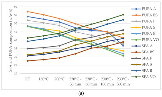 According to Figure 4, heating sunflower oil led to an increase in the proportion of total SFAs and a decrease in total PUFAs (Figure 4a).