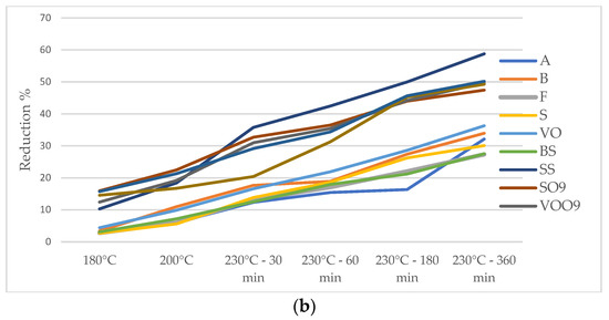 (a) SFA and PUFA changes during heating at 180 °C, 200 °C, and 230 °C—30 min, 60 min, 180 min, and 360 min—in sunflower oils. (b) LA reduction % in traditional and high-oleic sunflower oils.