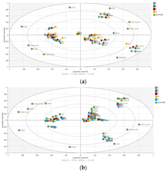 For a better overview and easier data interpretation, the scores and loadings of the PCA model were co-charted in biplots (Figure 5a,b). Models with four principal components (PCs) emerged which explained >90% of the cumulative variance. The biplot of the first two PCs, accounting for more than 60% of the total variability in the analyzed dataset, seemed to group and order the edible oil samples according to the type of oil and frying time and temperatures.