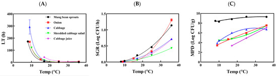 The growth of Salmonella spp. was not observed in mung bean sprouts at temperatures below 8 °C, in raw onion and cabbage below 9 °C, in RTE shredded cabbage salad below 10 °C, and in cabbage juice below 17 °C (Table 2). These findings demonstrate that maintaining specific storage temperatures effectively inhibits the growth of Salmonella spp. in both raw and processed vegetables. Notably, at 8 °C, the LT for Salmonella spp. in mung bean sprouts was approximately 10 times longer, and the SGR was three times slower compared to those at 10 °C. This finding highlights the significant impact that even a slight reduction in refrigerator storage temperature can have on enhancing the microbiological safety of mung bean sprouts.