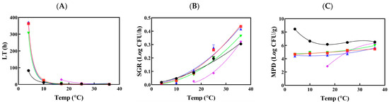 The longest LT for Salmonella spp. was observed in raw cabbage (Figure 1A) among the samples, whereas the most rapid growth was observed in mung bean sprouts (Figure 1B). Across all temperatures, the highest MPD values exceeding 8 log CFU/g were consistently recorded for Salmonella spp. in mung bean sprouts (Figure 1C). However, L. monocytogenes exhibited faster growth than Salmonella spp. in mung bean sprouts at refrigerated temperatures due to its psychrophilic nature. The MPD value of L. monocytogenes was also significantly higher at 4 °C compared to other temperatures (Figure 2C), which can be attributed to reduced growth of background microbiota in mung bean sprouts at 4 °C compared to 10 °C. The predominant spoilage microorganisms in vegetables include Gram-negative bacteria such as Pseudomonas, Enterobacter, and Flavobacterium [41].