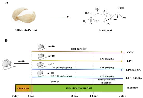 Schematic illustration of the structure of SA obtained from EBNs and the experimental protocol. SA specially refers to Neu5Ac in EBNs (A). The ICR mice were assigned to four groups randomly (n = 10 per group)—the CON group, LPS group, LPS + 50 SA group, and LPS + 100 SA group—after 1 week of acclimation. All groups were reared with standard diets. In the LPS + 50 SA group and LPS + 100 SA group, mice were pre-gavaged with SA (50 mg/kg/day and 100 mg/kg/day) for two consecutive days. Two hours after the last gavage, the mice were injected with 5 mg/kg LPS (LPS group, LPS + 50 SA group, and LPS + 100 SA group) or normal saline (CON group) intraperitoneally. At 24 h after treatment with LPS, the mice were sacrificed for further analysis (B). CON: control; EBN: edible bird’s nest; LPS: lipopolysaccharide; Neu5Ac: N-acetylneuraminic acid; SA: sialic acid.