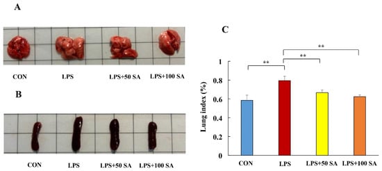Changes in the lung and spleen tissues are critical indicators of ALI. After the experiments, the lung and spleen tissues were photographed and measured to investigate the protective role of SA in LPS-stimulated mice. The mice in the LPS group had a marked swollen lung and what appeared to be severe pulmonary lesions, suggesting the ALI model’s success (Figure 2A). Nevertheless, SA intragastric administration significantly improved LPS-induced lung injury. It could partially restore the lung index (lung weight divided by body weight). The lung indexes in the CON group, LPS group, LPS + 50 SA group, and LPS + 100 SA group were 0.58 ± 0.06%, 0.79 ± 0.05%, 0.67 ± 0.03%, and 0.62 ± 0.02% (p < 0.01), respectively (Figure 2C). The spleen plays the immunomodulatory role in the body, and it was also impaired in the LPS-treated mice. The size of the spleen was greater in the LPS group, but splenomegaly was ameliorated by SA treatment (Figure 2B). These results clearly reveal that SA had a beneficial effect on LPS-induced ALI.