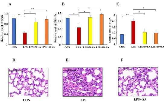 Oxidative stress could reflect the status of a lung injury. The MDA content and the activities of SOD and GSH-Px were evaluated in this study. The oxidative damage can be characterized by these indexes. As shown in Figure 3A,B, a considerable decrease in SOD and GSH-Px activities was detected in the LPS group. The SOD activity decreased the most after LPS treatment, reducing by 54.85% (p < 0.01), while the SOD activity in the SA protected group was much higher than that in the LPS group. In addition, the GSH-Px activity was reduced by 35.56% (p < 0.05) in the LPS-treated mice. SA administration observably reversed the decline in GSH-Px activity. In comparison with the CON group, the content of MDA significantly increased (1.38 fold) in the model group. SA treatment showed suppression of the MDA level. In particular, the level of MDA was successfully decreased by 52.10% after 100 mg/kg SA supplementation (Figure 3C). These figures could illustrate that SA intervention apparently relieved the oxidative stress in the LPS-induced mice.