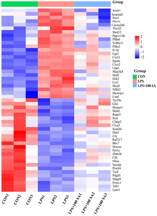 Transcriptome analysis of pulmonary tissues from mice. DEGs were screened among the CON group, LPS group, and LPS + 100 SA group. The genes upregulated in LPS/CON and downregulated in LPS + 100 SA/LPS groups and vice versa were considered the DEGs of SA against ALI, with a p value < 0.05 and fold change >1.5 or <0.667 regarded as the threshold for significant DEGs. In all, 51 DEGs were screened and analyzed by hierarchical clustering. ALI: acute lung injury; CON: control; DEGs: differentially expressed genes; LPS: lipopolysaccharide; LPS + 100 SA: LPS + 100 mg/kg/day SA; SA: sialic acid.