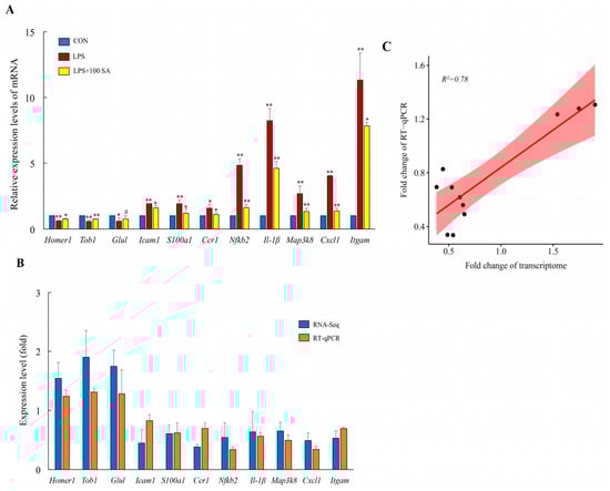 SA reversed LPS-induced pulmonary gene expressions. The dosage of SA in the SA group was 100 mg/kg/day, and 11 DEGs were selected for further validation through an RT-qPCR assay (A). Fold changes of 11 DEGs between transcriptome sequencing and the RT-qPCR assay (B). Linear correlation of 11 DEGs between RNA-seq and RT-qPCR (C). CON: control; DEGs: differentially expressed genes; LPS: lipopolysaccharide; LPS + 100 SA: LPS + 100 mg/kg/day SA; SA: sialic acid. Data are presented as the mean ± SD of three independent experiments. * p value was less than 0.05. ** p value was less than 0.01. #: p > 0.05.