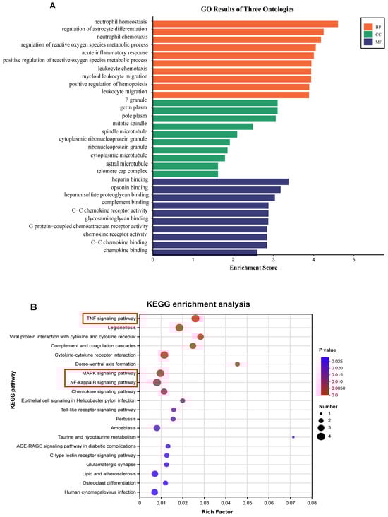 GO and KEGG analyses were used for further exploring the functional relevance and pathways of DEGs. The GO analysis indicated that the DEGs were associated with various functions, including the biological process (BP), cellular component (CC), and molecular function (MF). The main GO terms enriched by DEGs were relevant to neutrophil homeostasis, the regulation of reactive oxygen species metabolic process, acute inflammatory response, C-C chemokine receptor activity, chemokine receptor activity, and chemokine binding, among others (Figure 6A). These revealed terms were thought to be interrelated with inflammation and oxidation. Meanwhile, KEGG pathway analysis of the DEGs was conducted to reflect the possible pathways involved in the protection of SA in LPS-induced mice. It was found that the DEGs were enriched in the TNF signaling pathway, Legionellosis, MAPK signaling pathway, NF-κB signaling pathway, and chemokine signaling pathway, among others (Figure 6B). The presented pathways play a key impact in regulating inflammation. These results indicate that SA could modulate these signaling pathways, thereby inhibiting the expression of inflammatory factors and protecting against ALI in mice.
